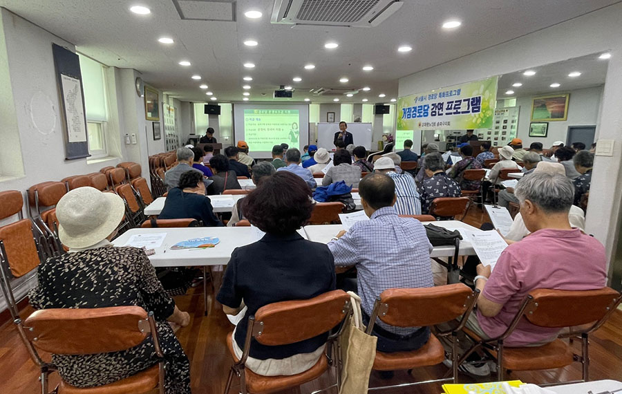 지난 8월 29일 본지회 3층에서 서울시 특화사업으로 개방형경로당 '광역강연프로그램(거점경로당)' 과 '건강 걷기프로그램' 을 실시하였다. 송파동, 석촌동, 삼전동, 문정동, 방이동, 가락동 일부 35개소 경로당 회장이 한자리에 모여서 ''2025년 회계 및 정산교육'과 ‘노인학대 예방 교육’ , '보이스피싱교육', '폭력예방교육' 과 건강걷기대회에 참석하였다.![]()