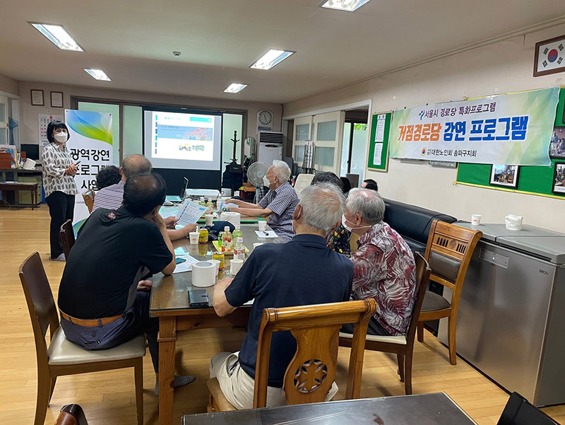 지난 8월 19일 잠실동 '잠실동 '파크리오2경로당'에서 서울시 특화사업으로 개방형경로당 '광역강연프로그램(거점경로당)' 과 '건강 걷기프로그램'을 실시하였다. 잠실동 7개 경로당 회장이 한자리에 모여서 '2022년 회계 및 정산교육'과 건강걷기대회에 참석하였다