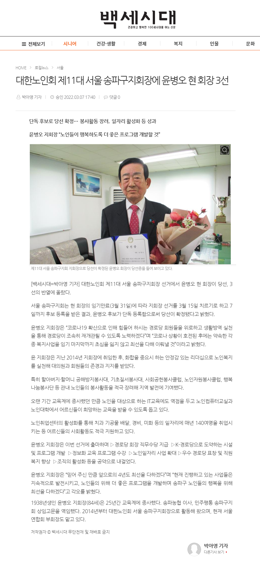 대한노인회 제11대 서울 송파구지회장 윤병오 현 회장 3선<백세시대>