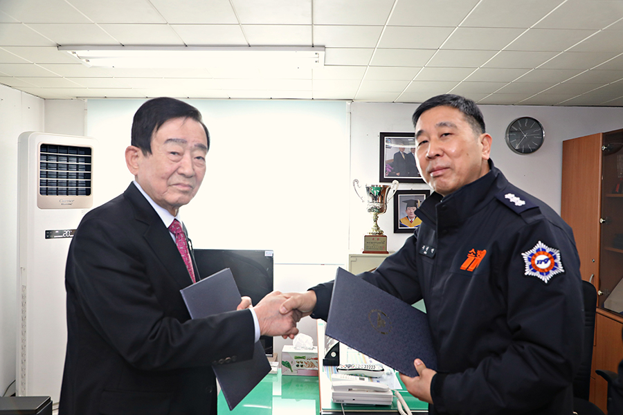 <본지회 윤병오지회장(왼쪽)과 김명호송파소방서장>![]()