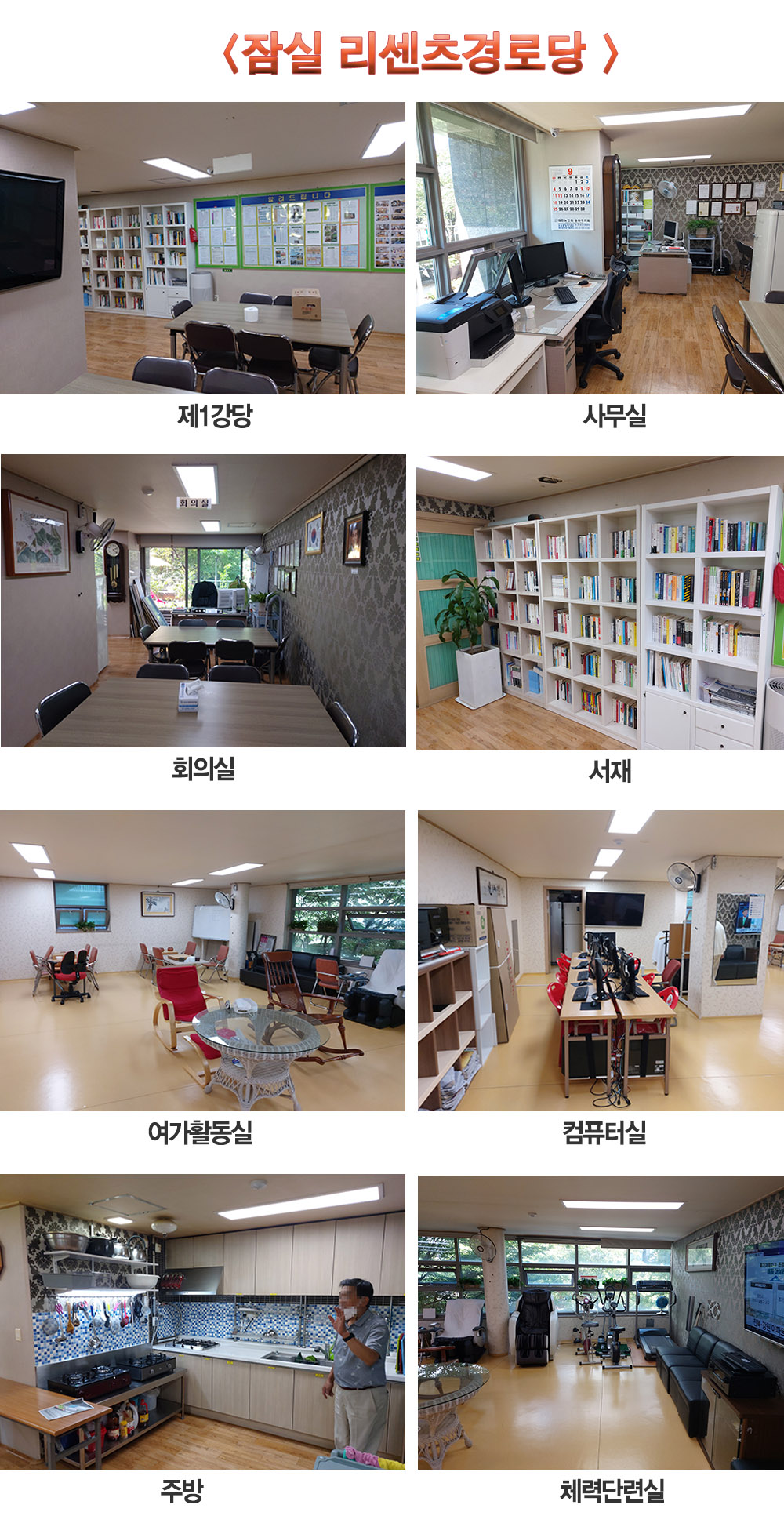 잠실 리센츠경로당(회장 서정만)은 컴퓨터실, 체육단련실, 다용도실 등 다양한 시설과 실버체조, 안마 등 여러가지 프로그램을 실시해 모범경로당으로 경로당회원들로부터 찬사를 받고 있다.