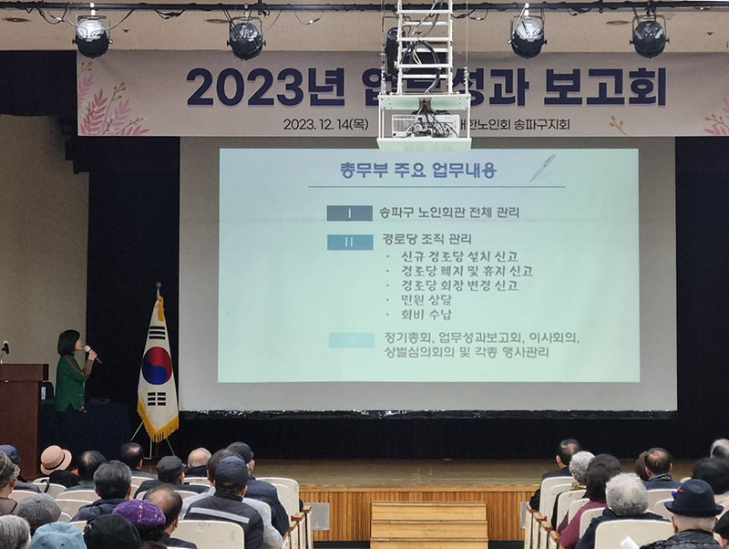 지난 12월 14(목) 본 지회는 경로당 회장 180명이 참석한 가운데, 송파여성문화회관 6층에서 '2023년 업무성과보고회'를 개최했다. '헬리오시티 시니어 하모니카 합주단'이 식전 축하공연을 시작으로 송파구지회상(우수경로당) 시상식을 거행했다. 또 윤병오지회장의 인사말과 남인순의원으 격려사가 이어졌으며, 총무부, 경로부, 취업지원센터의 각 부서별 업무보고가 이루어졌다.![]()