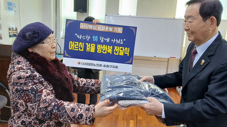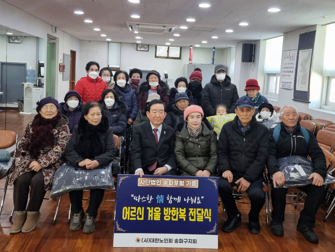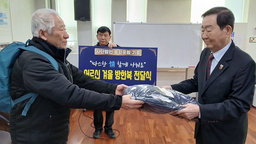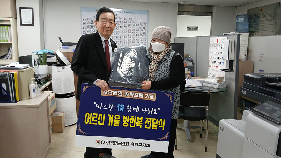 송파포럼(회장 홍재성)은 지난달 제70차 송파포럼 및 불우이웃돕기 바자회를 개최하여 1,850만원을 마련하였다. 바자회를 통한 수익금 1,850만원으로 블랙야크 방한복 100벌과 후원금 500만원을 마련하였다. 이중 방한복 20벌과 후원금 100만원을 본지회에 기증하였다. 이에 본지회는 지난 1월 10일 지회 3층에서 송파구 어려운 어르신들에게 방한복를 전달하였으며, 후원금 100만원은 구립경로당 20군데 김치를 전달할 예정이다.