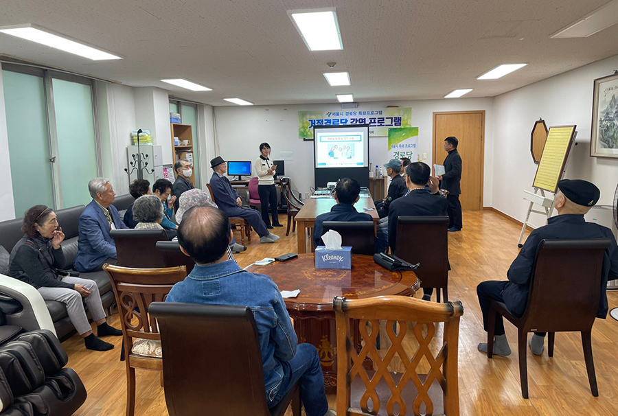 본지회는 지난 10월 6일 잠실동 '레이크팰리스 경로당'에서 서울시 특화사업으로 개방형경로당 '광역강연프로그램(거점경로당)' 과 '건강 걷기프로그램'을 실시하였다. 잠실동 20개소 경로당 회장이 한자리에 모여서 '2023년 회계 및 정산교육'과 ‘노인학대 예방 교육’, '건강걷기 대회'에 참석하였다.![]()