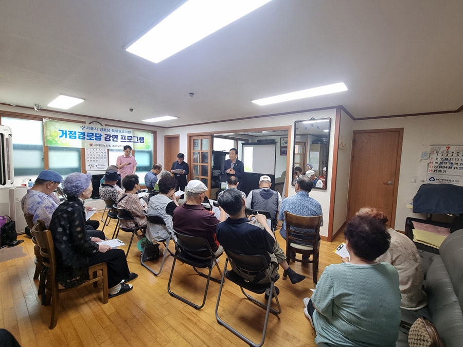 본지회는 지난 7월 30일 거여동 거여새마을경로당에서 서울시 특화사업으로 개방형경로당 '광역강연프로그램(거점경로당)' 과 '건강 걷기프로그램'을 실시하였다. 거여동 17개소 경로당 회장이 한자리에 모여서 '2024년 회계 및 정산교육'과 ‘노인학대 예방 교육’, '안전사고(낙상사고)와 건강걷기 대회에 참석하였다.![]()