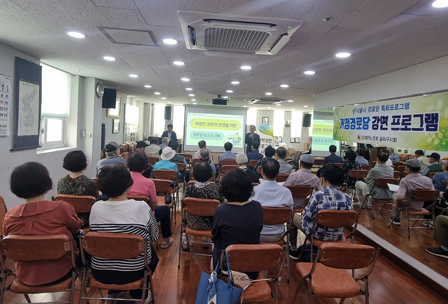 본지회는 지난 8월 29일 서울시 특화사업으로 개방형경로당 '광역강연프로그램(거점경로당)' 과 '건강 걷기프로그램' 을 실시하였다. 송파동, 석촌동, 삼전동, 문정동, 방이동, 가락동 일부 35개소 경로당 회장이 한자리에 모여서 '2025년 회계 및 정산교육'과 ‘노인학대 예방 교육’ , '보이스피싱교육', '폭력예방교육' 과 건강걷기대회에 참석하였다.![]()