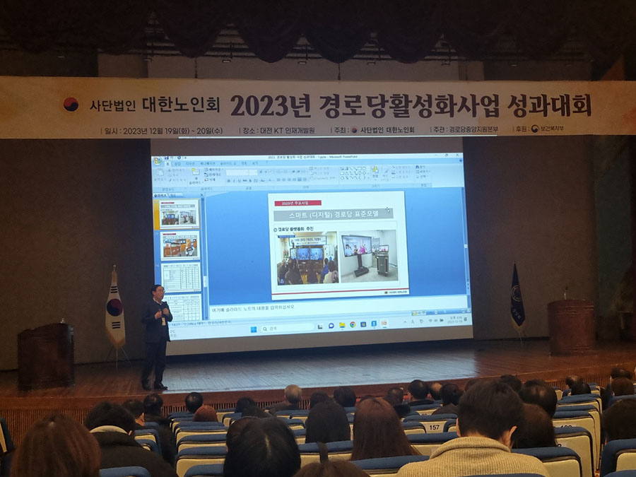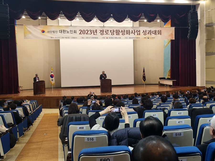 (사)대한노인회 중앙회(김호일회장)가 12월 19일, 20일 이틀간 대전 KT인재개발원에서 ‘2023년 경로당활성화사업 성과대회’를 개최했다. 대회 첫날에는 우수기관‧직원 시상식 및 정년 퇴직자 공로패 수여되었다. 본지회는 경로당활성화 사업 지회 우수기관으로 선정되어 수상했다.
