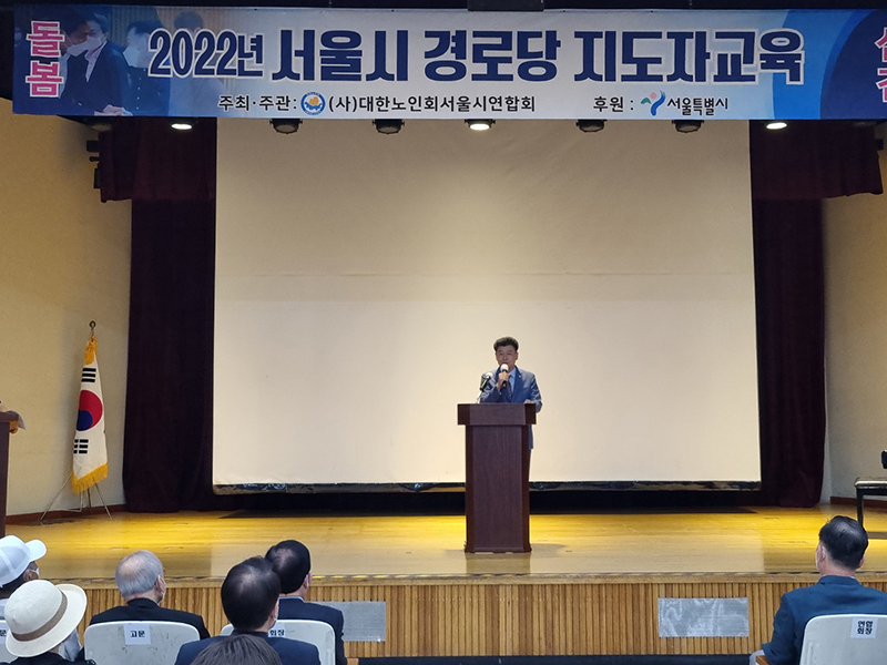 지난 8월 25일 송파여성문화회관에서 서울시연합회 주관으로 '2022년 서울시 경로당 지도자교육'을 실시했으며 송파구 174개 경로당회장과 총무 300여명이 참석했다. 1부에서는 송파구 윤병오지회장의 인사말과 서강석 송파구청장, 박경래의장의 격려사와 고광선 서울시연합회장의 인사말과 특강이 이어졌다.