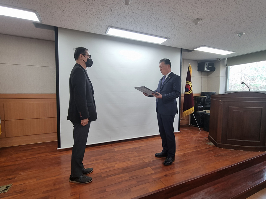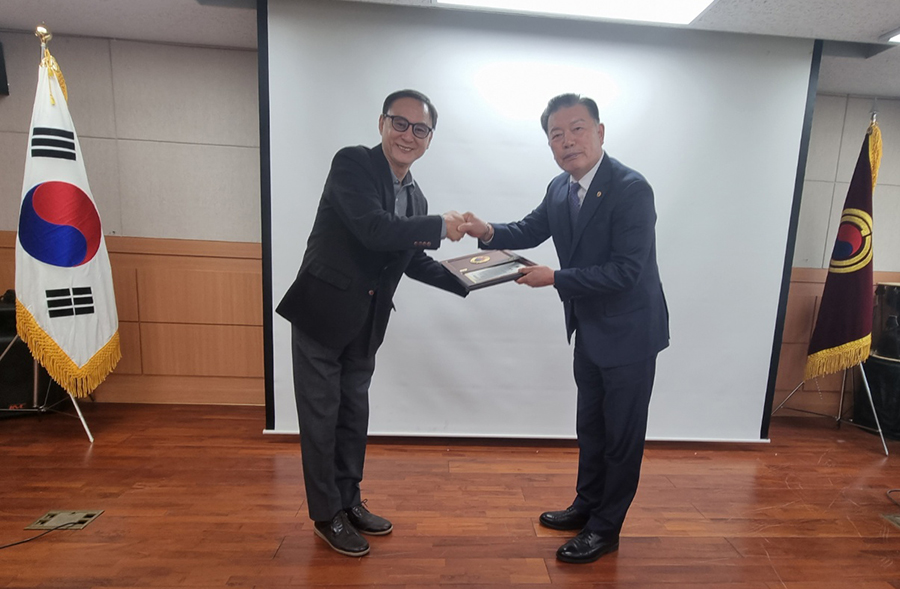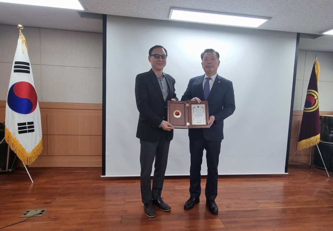 <서울시연합회 표창장 수여식 진행 조인걸사무국장(왼쪽)과 고광선 서울시연합회장(오른쪽)>![]()