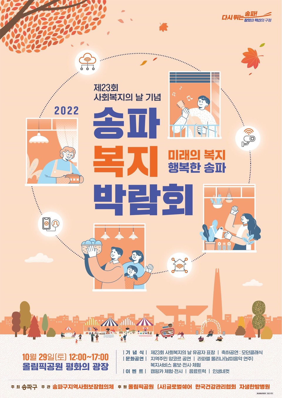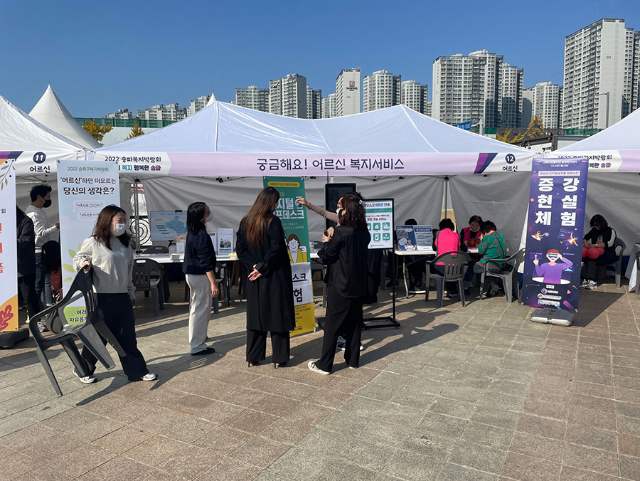 남녀노소 복지의 모든것을 즐겁게 체험할수 있는 2022년 송파복지박람회가 10월 29일(토) 12:00~17:00까지 '올림픽공원 평화의광장'에서 열렸다. 장애인인식개선을 위한 장애처험, 시각장애인 향기컨설팅, 반려로봇인형소개,어르신스마트기기교육, 노인체험센터 등 10개분야 30개부스가 운영되었다.