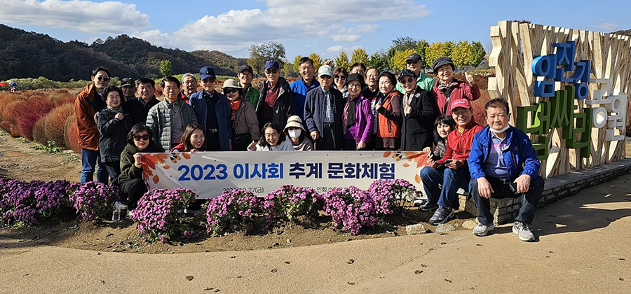 지난 2023년 10월 27일 송파지회 이사 20명은 경기도 연천으로 '2023년 이사회 추계 문화체험' 을 다녀왔다. 오전에는 임진강 댑싸리공원과 태풍전망대를 견학하고, 점식식사후 재인폭포 출렁다리와 전곡 선사박물관 국화꽃 축제에 참여했다.![]()
