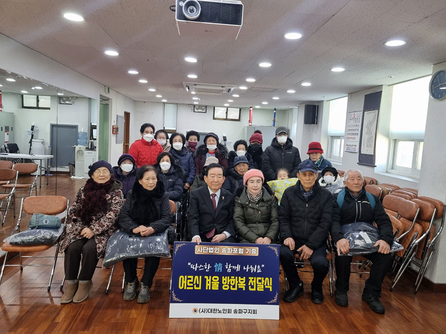 송파포럼(회장 홍재성)은 지난달 제70차 송파포럼 및 불우이웃돕기 바자회를 개최하여 1,850만원을 마련하였다. 바자회를 통한 수익금 1,850만원으로 블랙야크 방한복 100벌과 후원금 500만원을 마련하였다. 이중 방한복 20벌과 후원금 100만원을 본지회에 기증하였다. 이에 본지회는 지난 1월 10일 지회 3층에서 송파구 어려운 어르신들에게 방한복를 전달하였으며, 후원금 100만원은 구립경로당 20군데 김치를 전달할 예정이다.