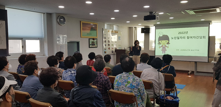 지난 9월 22일 지회 3층에서 노인일자리(경로당중식도우미사업단/ 경로당청소도우미사업단) 참여자 63명이 참석한 가운데 간담회가 개최되었다. 참여자 활동 고충사항과 개선사항 및 기타의견 수렴 등으로 진행되었다.![]()