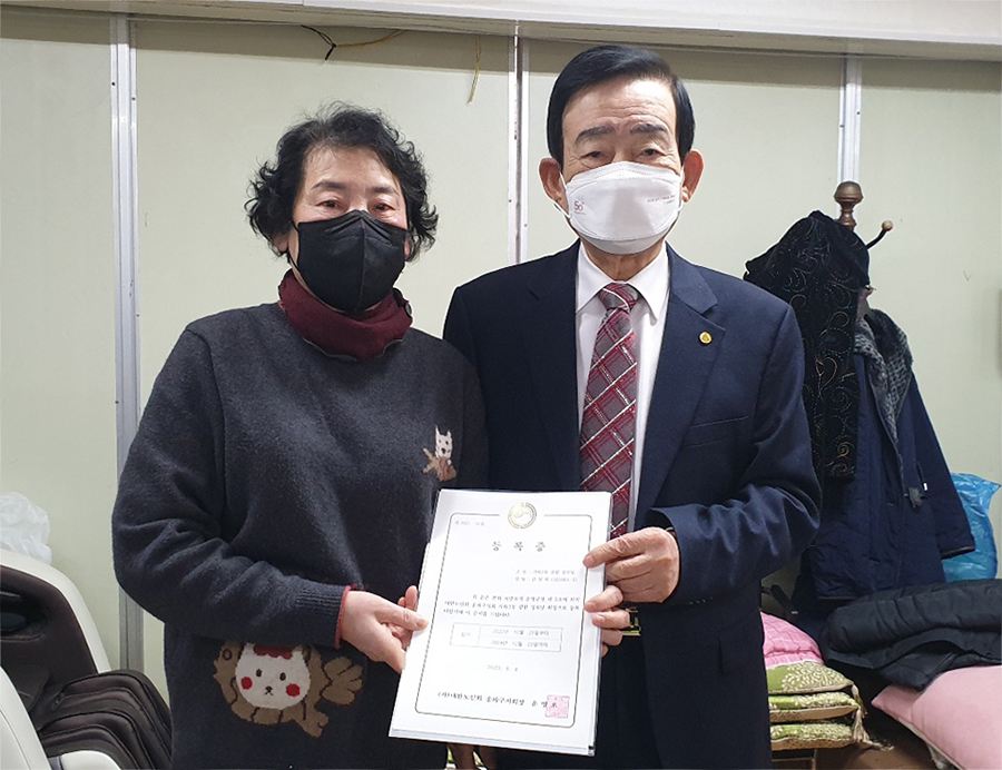지난 1월 11일 가락2동 삼환경로당 김영희 신임회장이 선출되어, 본 지회 윤병오지회장이 경로당 등록증을 수여했다.![]()