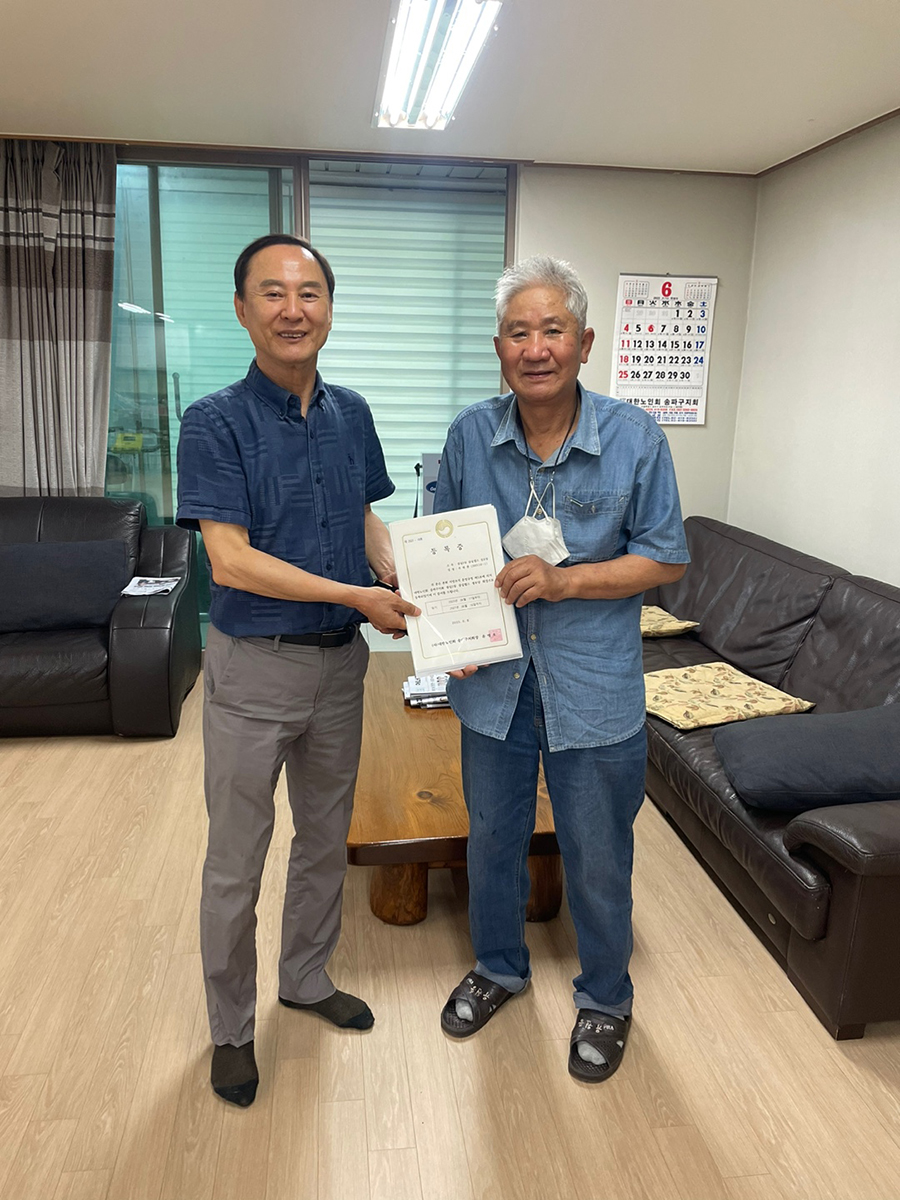 지난 6월 14일 잠실2동 엘스경로당 유원종 신임회장이 선출되어, 본 지회 조인걸사무국장이 경로당 등록증을 수여했다.![]()